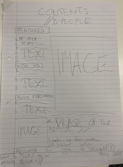 The mock below is ideally how I want to make my contents pages to look like. For the first front cover i'll have maximum of 3 pictures, and for the second front cover I'm planning to stick with one large picture and another smaller one. I will place date, issue number on the top so it is visible but is not too eye catching, is more for formality.